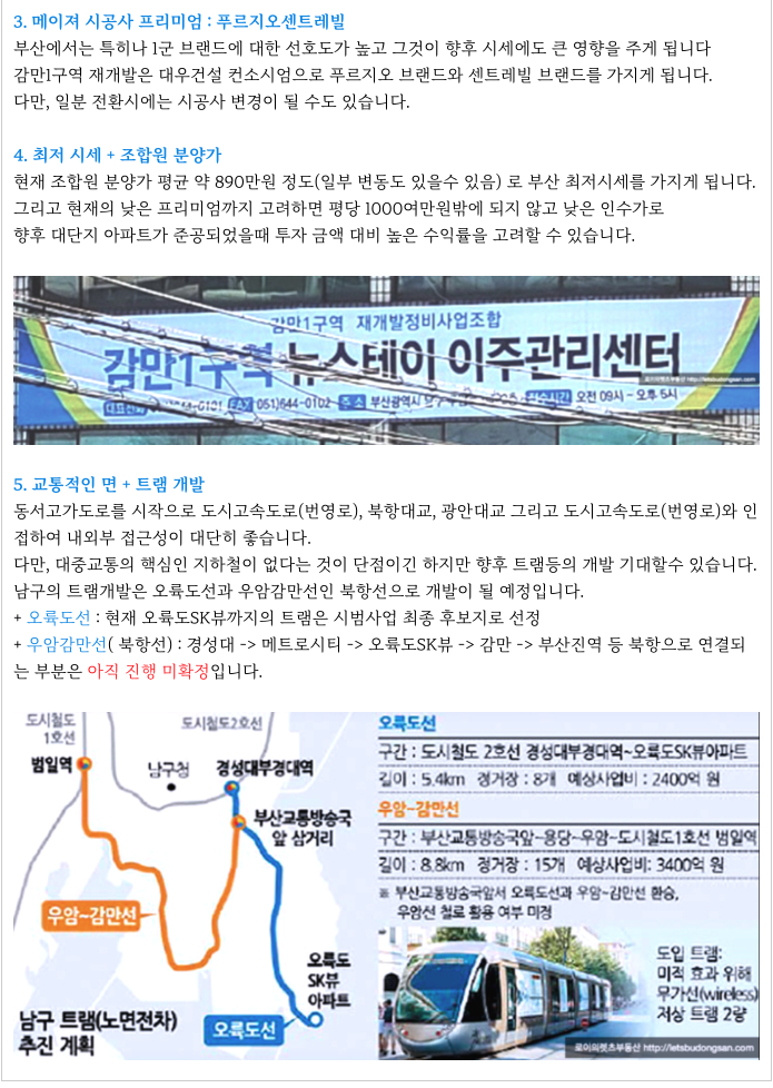 - 낮은 조합원 분양가 + 진행대비 시세 부산 시내 최저 : 약 평당 1000여만원 정도.