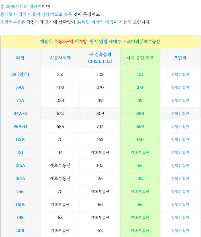 우동3구역 재개발 현재 계획된 타입별 세대수 소개해 드리곘습니다.