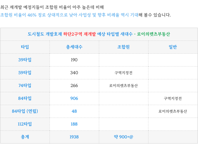 역세권 하단2구역 추진위 추정 각 타입별 세대수 정리 드립니다.