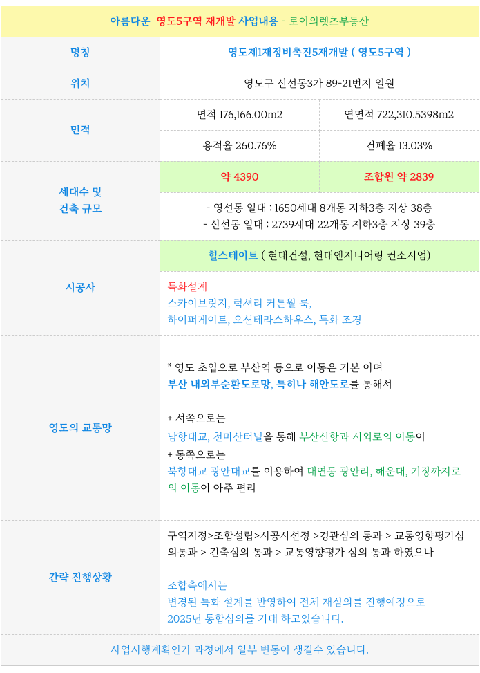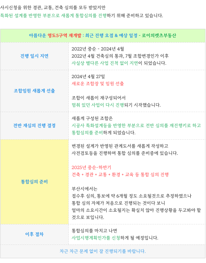 영도5구역 재개발은 새로운 설계 반영하여 통합 심의를 준비하며 앞두고 있습니다.