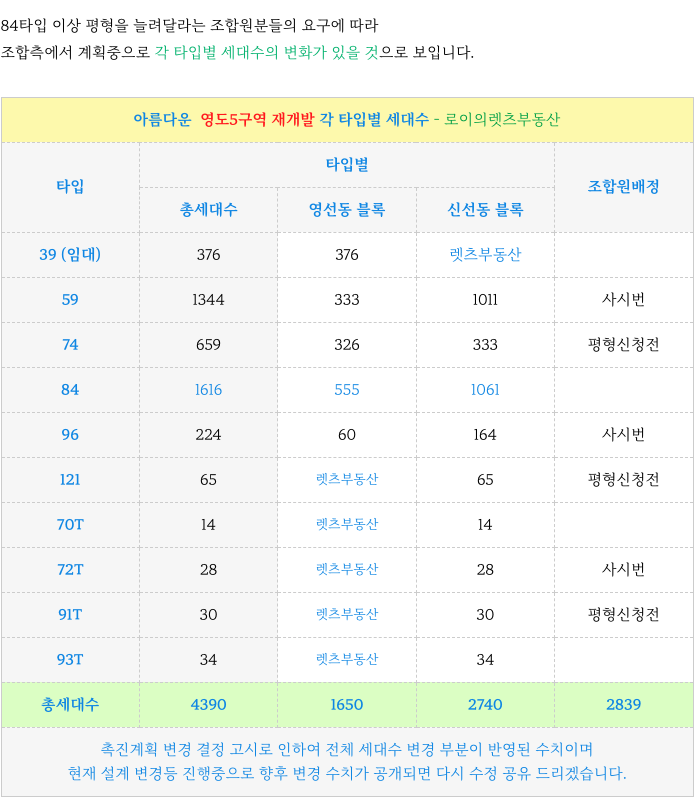 영도5구역 재개발 계획된 타입별 세대수 정리하였습니다.