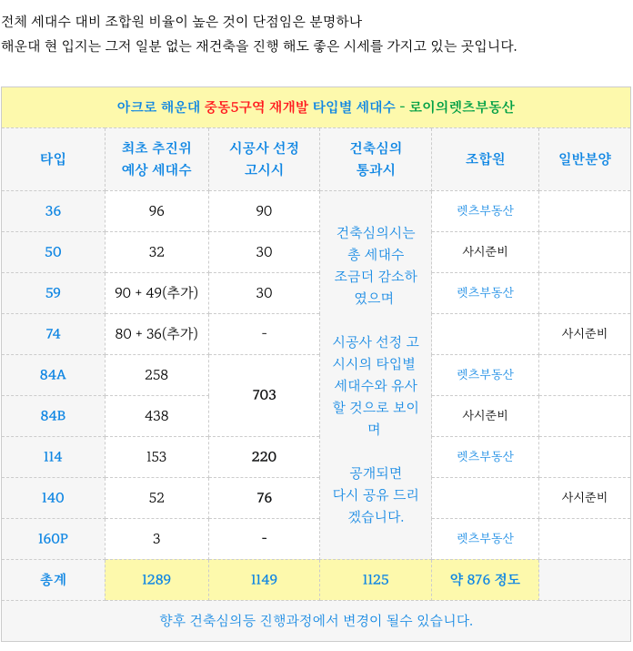 아크로 중동5구역 계획된 타입별 세대수 정리하였습니다.