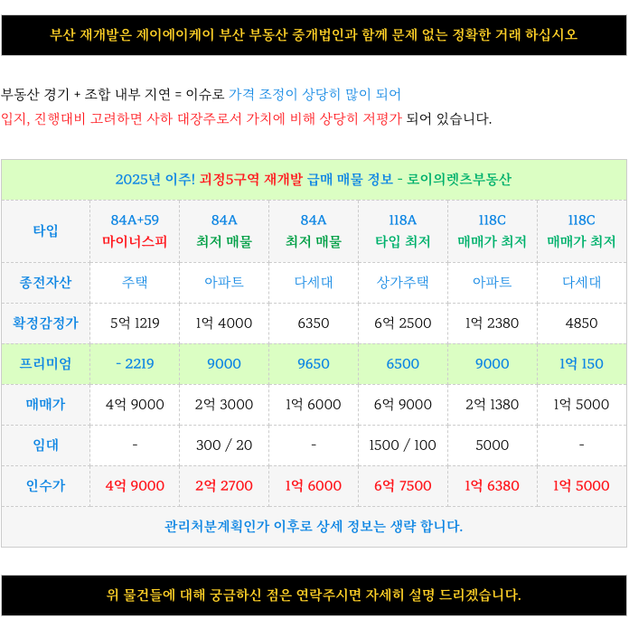 괴정5구역 재개발 각 타입별 최저 매물 정리하였습니다.