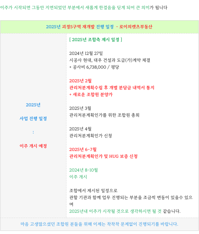 이주기대 괴정5구역 주요 진행 사항 & 2025년 일정 및 이후 진행 등 추가 정보는 아래 페이지를 참고 부탁드립니다.