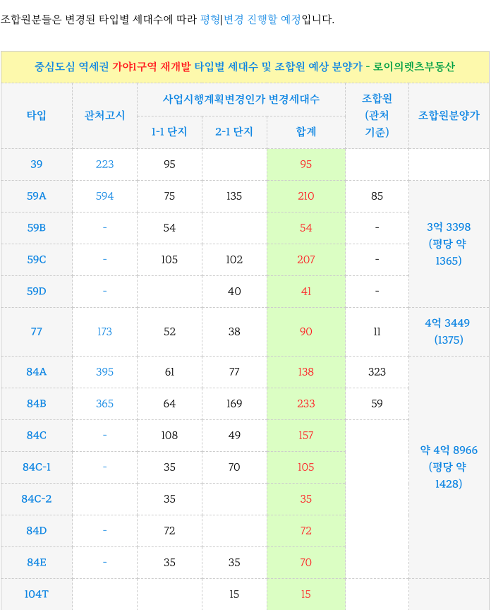 가야1구역 재개발 계획된 각 타입별 세대수 소개해 드리겠습니다.