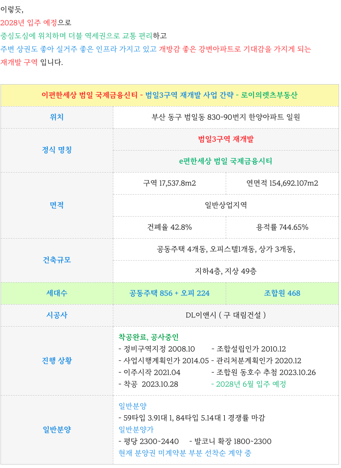 범일3구역 재개발 은 2028년 6월 입주 예정을 두고 현재 한창 공사중에 있습니다.