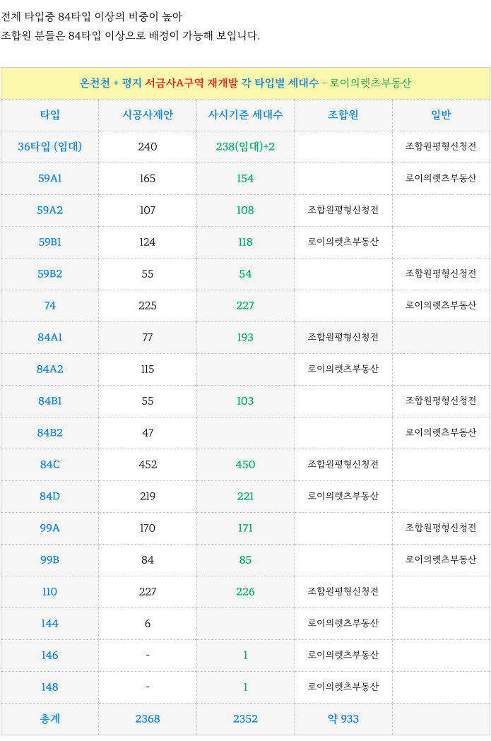 역세권 서금사A구역 사업시행계획인가 기준 각 타입별 세대수 정리하였습니다.