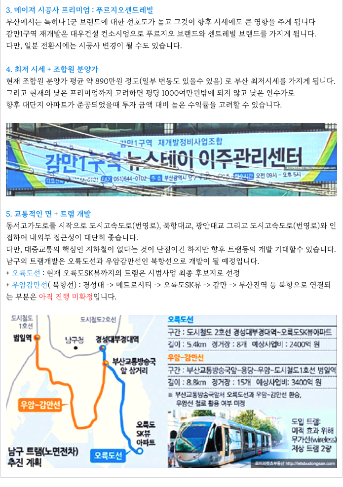 - 낮은 조합원 분양가 + 진행대비 시세 부산 시내 최저 : 약 평당 1000여만원 정도.