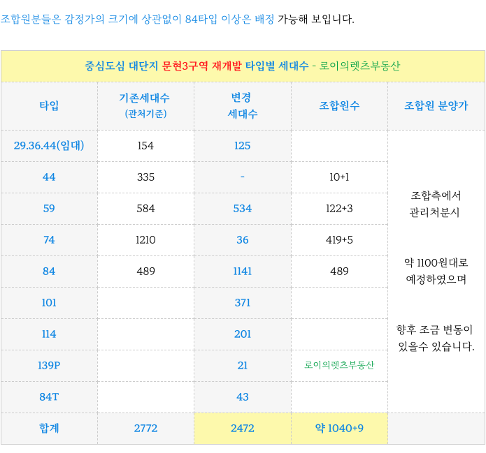 84타입 이상의 비중을 높여 타입별 세대수 변경을 진행중에 있으며