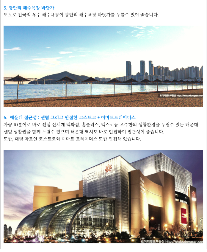 지하철 역세권에 아름다운 광안리 바닷가를 도로로 이용가능하다는 큰 장점을 가지고 있는 곳입니다.