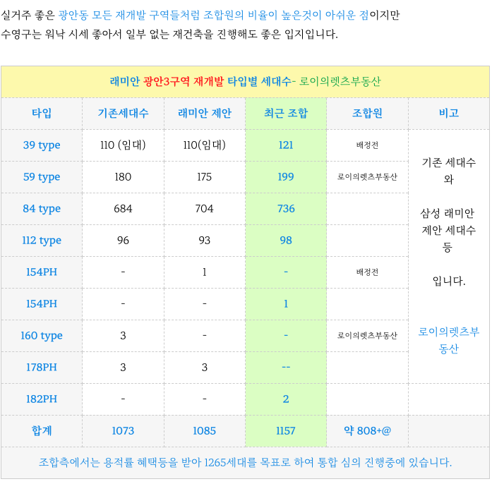 레미안 광안3구역 계획 타입별 세대수 소개해 드리겠습니다.