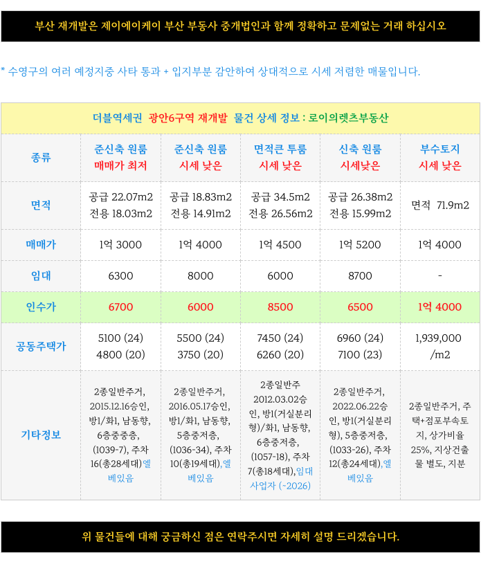 더블역세권 광안6구역 소액 매물 정리, 소개해 드리겠습니다.