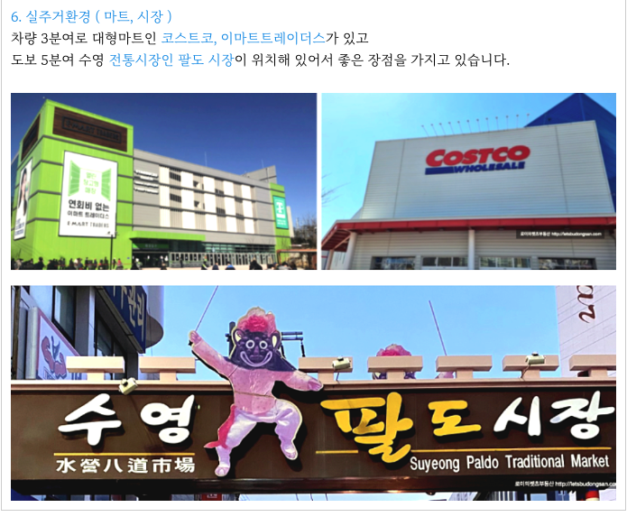 기본적으로 많은 병원과 상가 밀집한 수영역 상권과 전통 팔도시장 이용이 편리하고