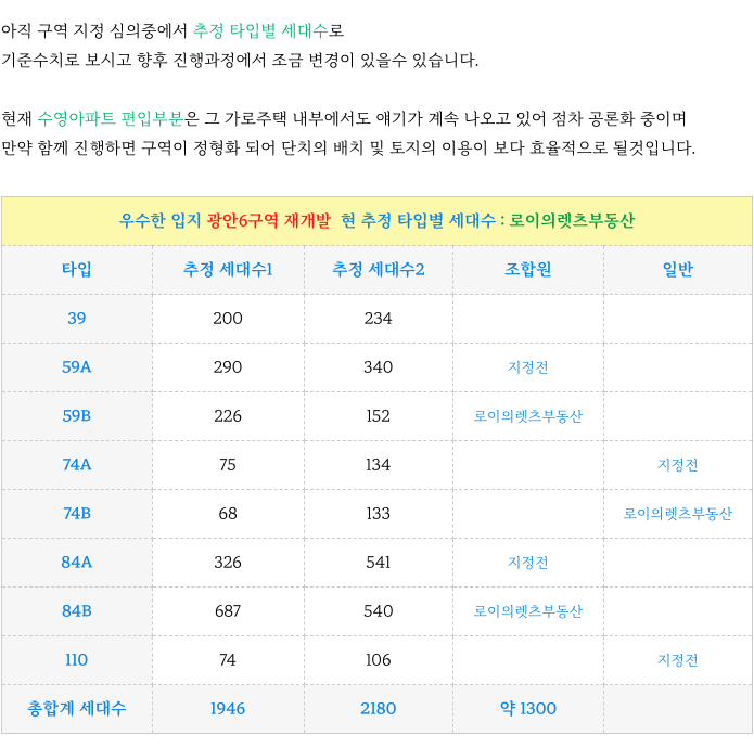 3. 광안6구역 재개발 현재 추정 타입별 세대수