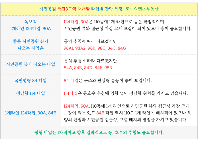 4. 시민공원 촉진3구역 재개발 : 타입별 세대수 그리고 각 특징