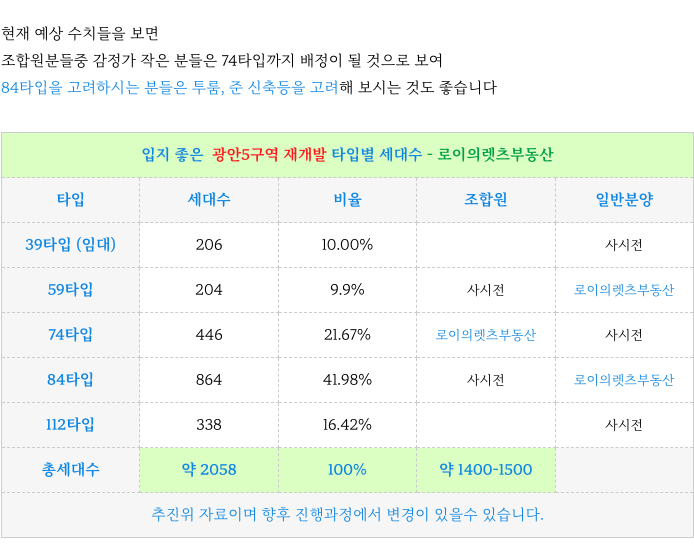 4. 현재 추정 타입별 세대수 : 광안5구역 재개발 :