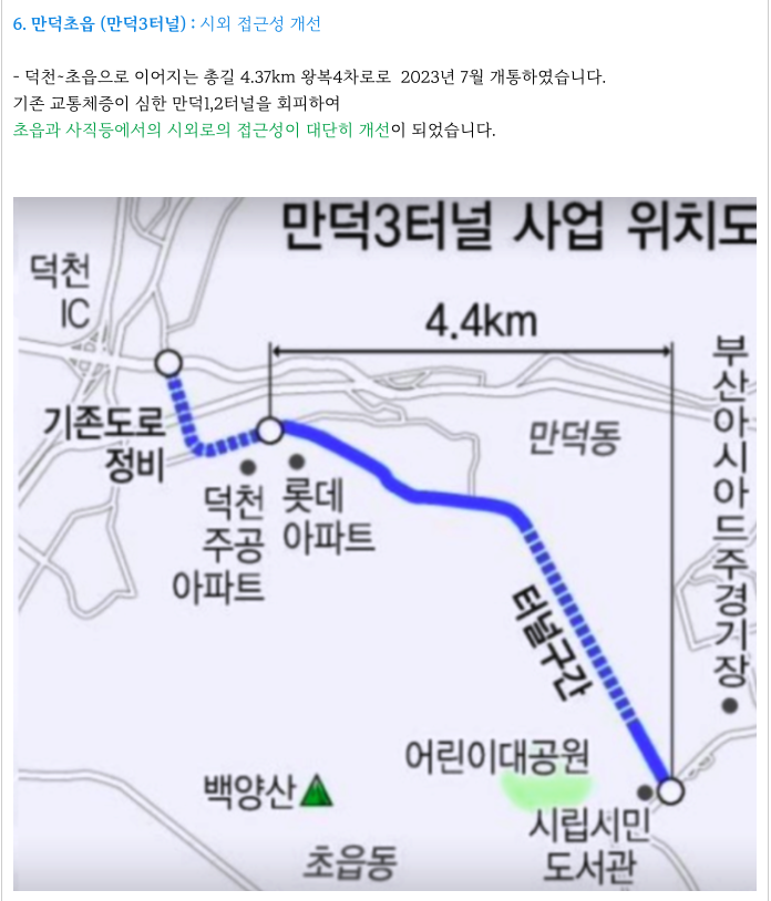 작년 개통한 만덕초읍터널 (만덕3터널)을 통해 시외로의 이동 역시 편리합니다.