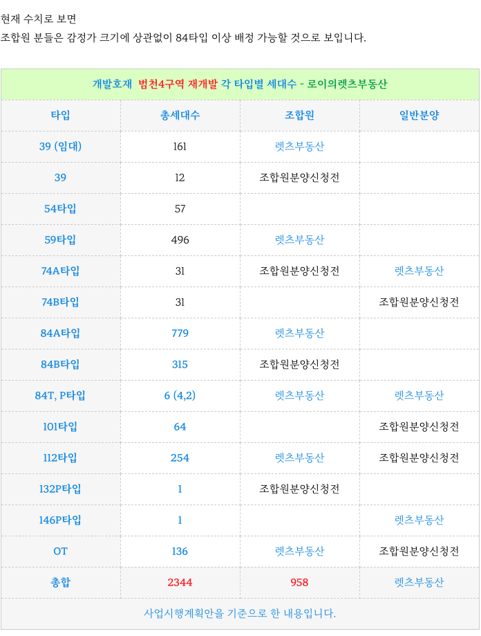 3. 계획된 각 타입별 세대수 : 범천4구역 재개발 :