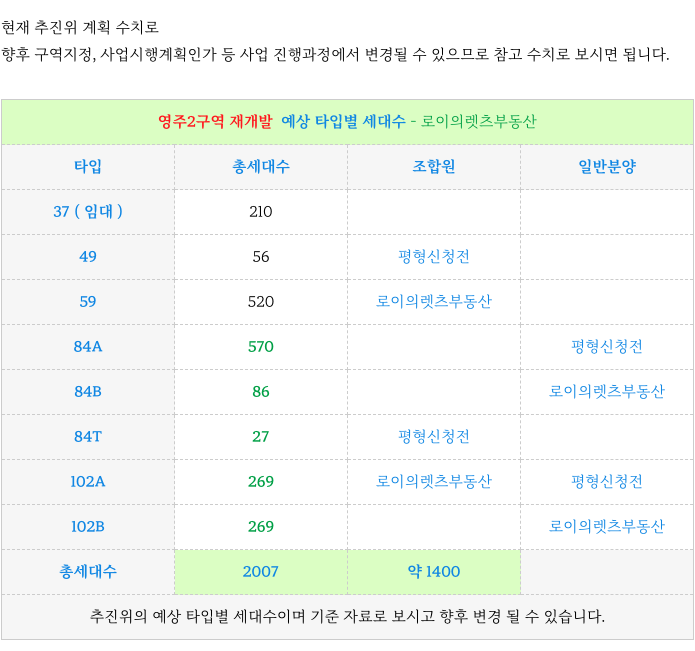 3. 계획된 각 타입별 세대수 : 영주2구역 재개발 :