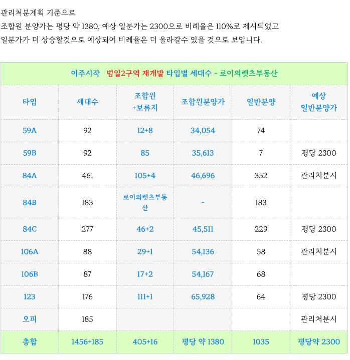 4. 범일2구역 재개발 : 조합원 동호수 배정 및 각 타입별 세대수, 조합원 분양가 :