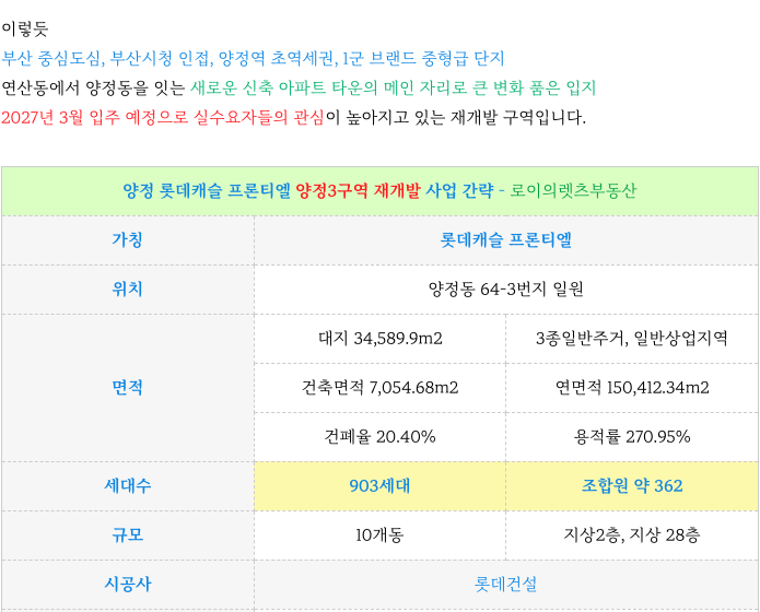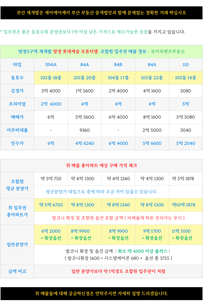 양정3구역 : 롯데캐슬 프론티엘 : 현 입주권 매물 총 아파트 가격 계산, 비교 : 2027 입주예정