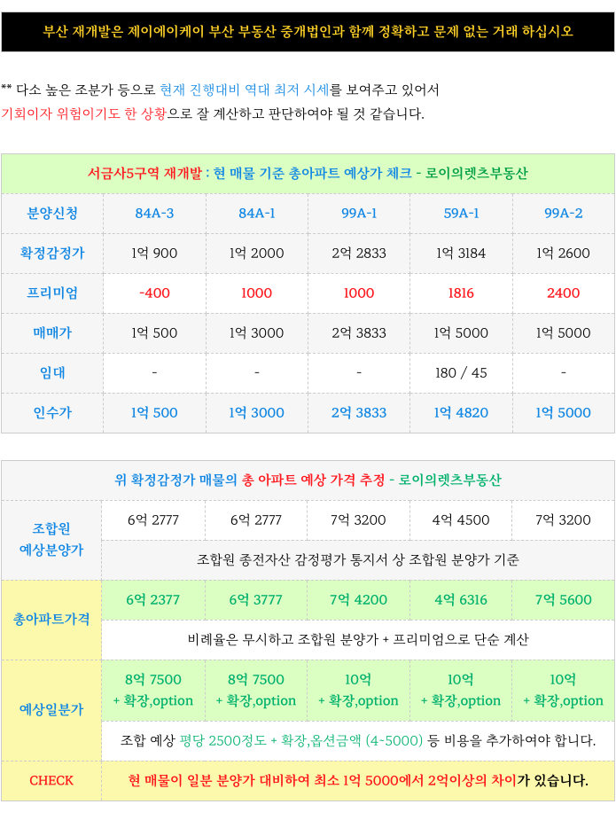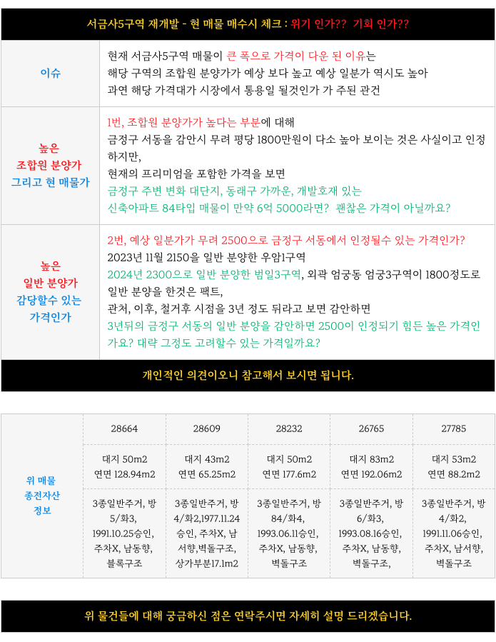 2. 현재 가능 매물 & 예상 총 아파트 가격 & 수익성 체크 : 서금사5구역 재개발 :