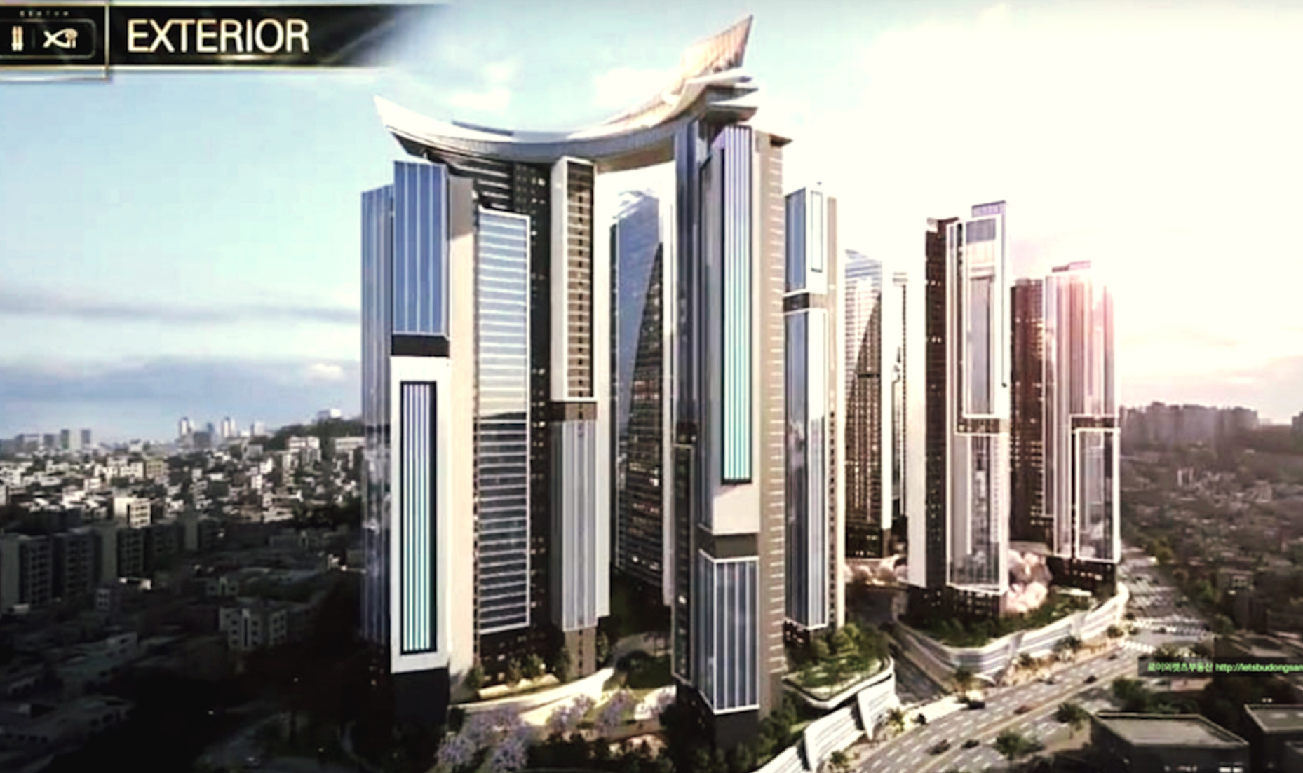 3개동을 연결하는 스카이브릿지와 외벽 LED 조명의 미디어 파사트 적용등 특화 설계와