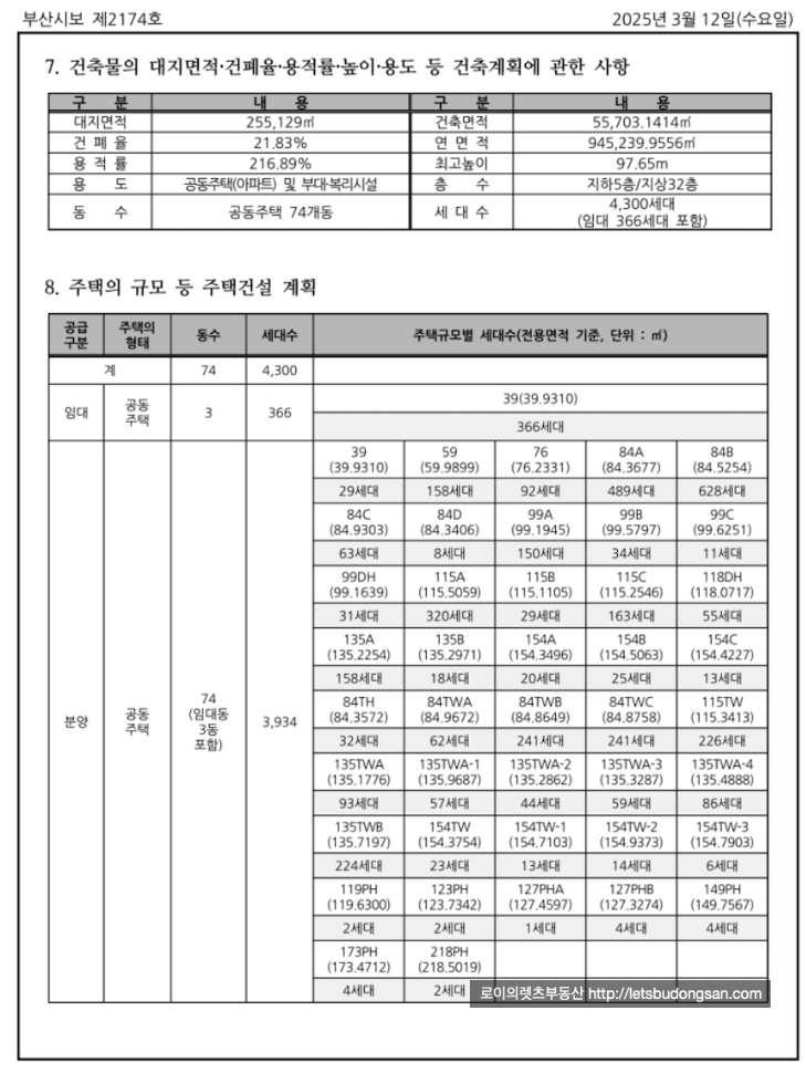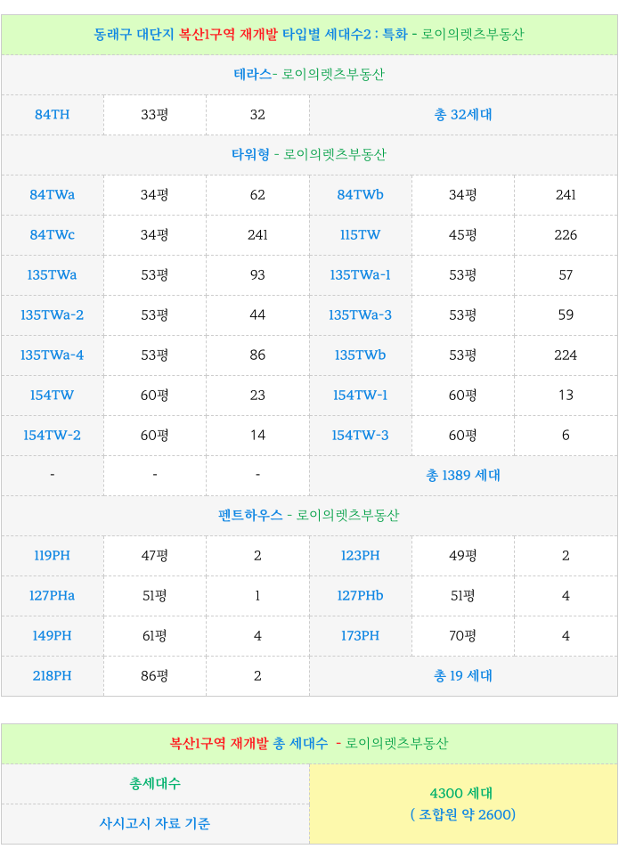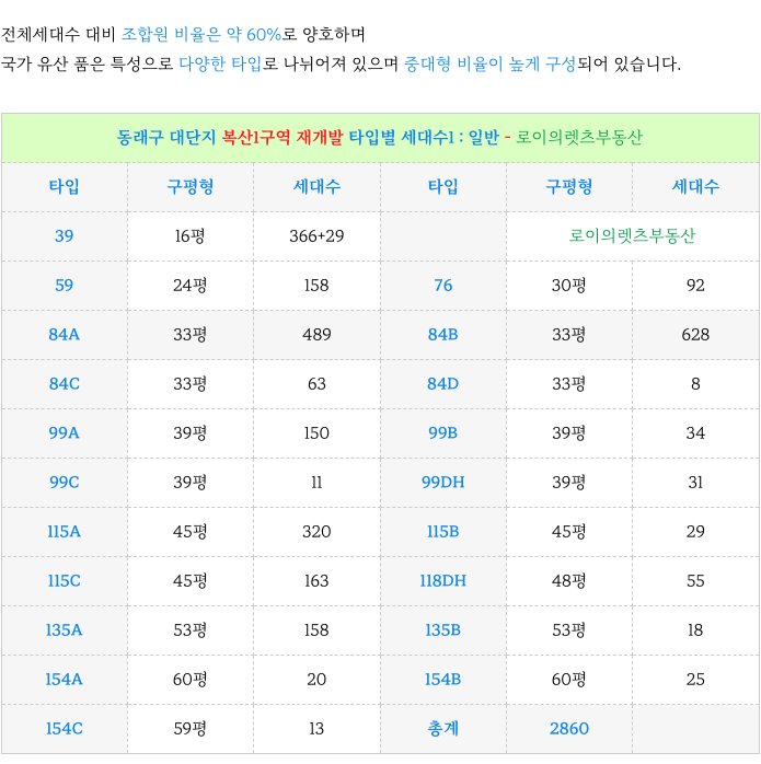 4. 계획된 각 타입별 세대수 : 복산구역 재개발 :