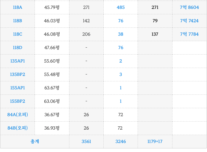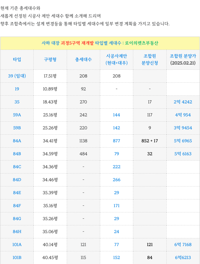 3. 괴정5구역 재개발 : 계획된 각 타입별 세대수 :