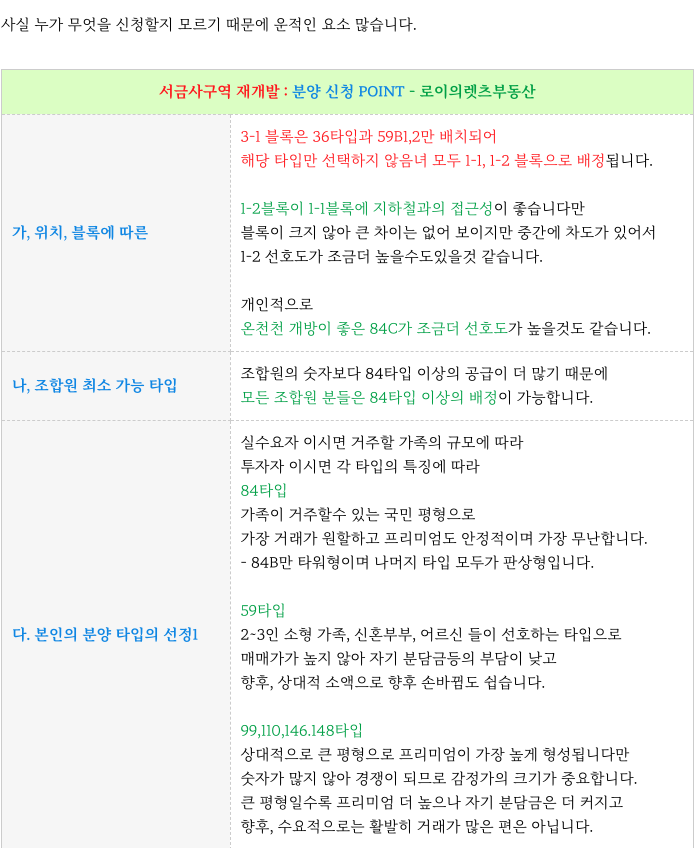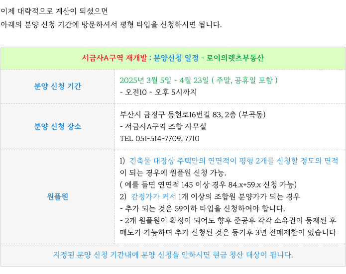5. 조합원 분양 신청 방법, 포인트, 고려 사항 : 서금사A구역 재개발 :
