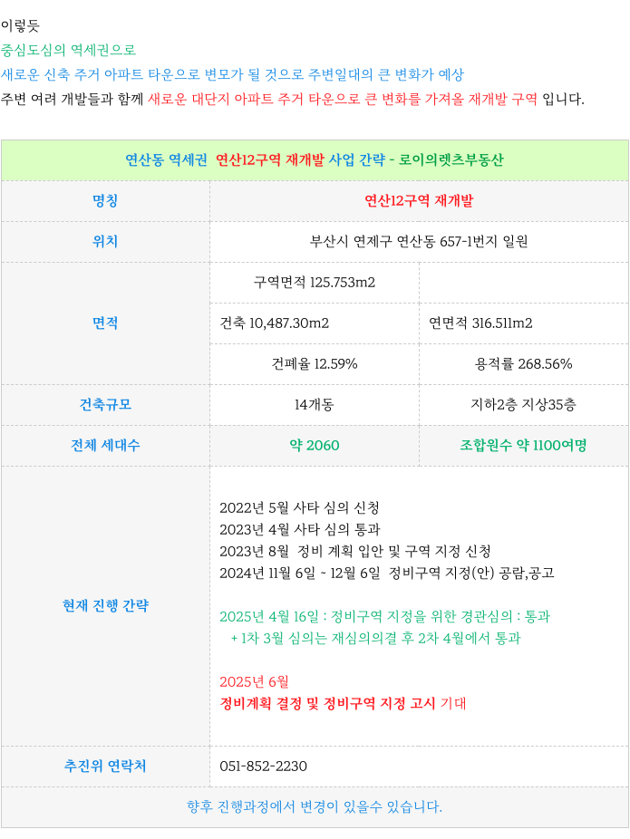 부산 전역 재개발에 대해 궁금하신 사항은 방문 또는 연락주시면 자세히 설명 드리겠습니다.