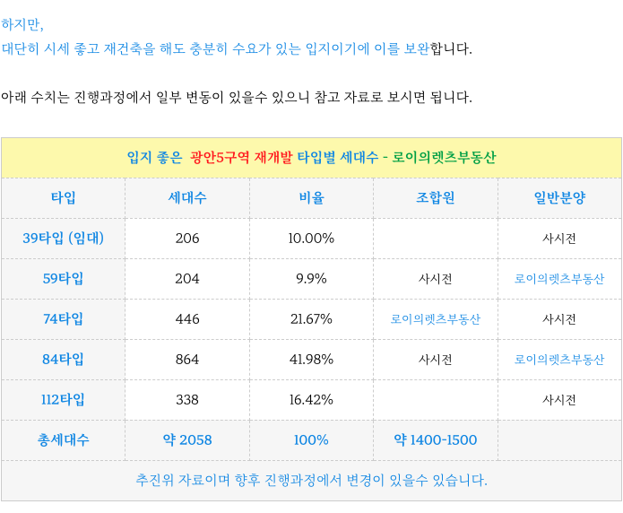 3. 광안5구역 재개발 : 계획된 각 타입별 세대수 :