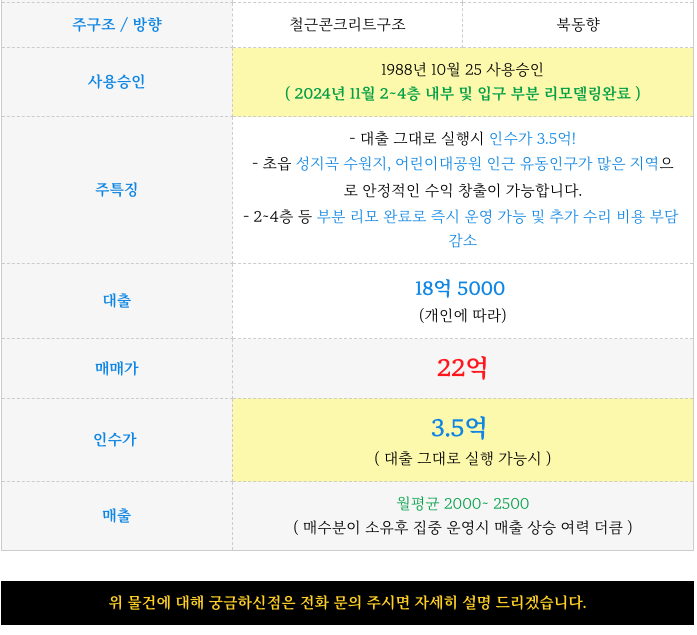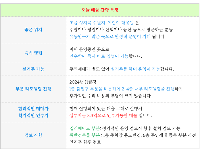 - 2~4층 등 부분 리모 완료로 즉시 운영 가능 및 추가 수리 비용 부담 감소
