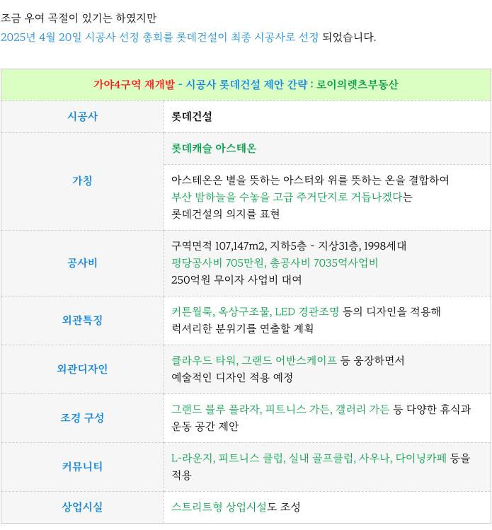 - 2025년 4월 20일 : 롯데건설 시공사 선정 : 롯데캐슬 아스테온