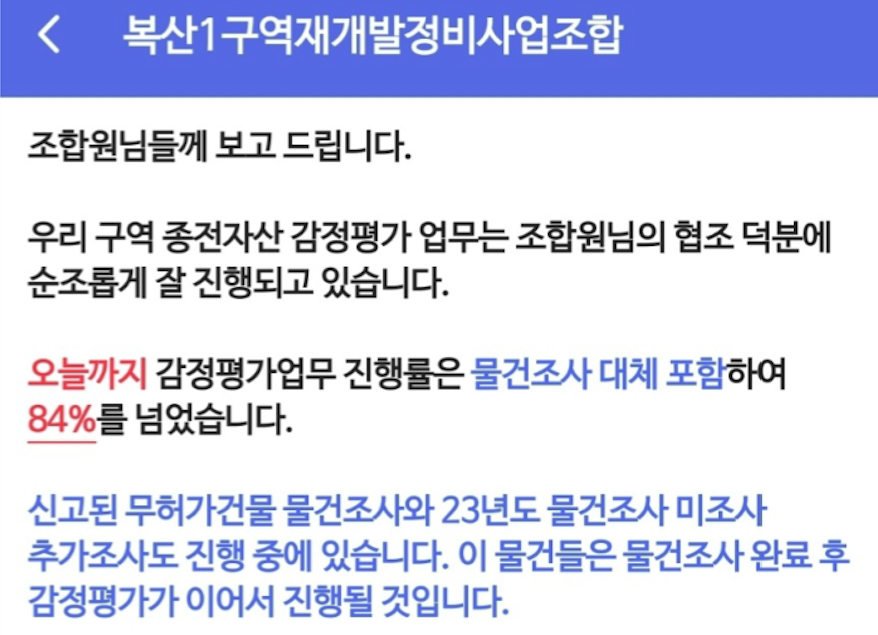 - 2025년 중순이후 : 조합원 종전자산 감정평가 통지 및 분양 신청 진행 예정