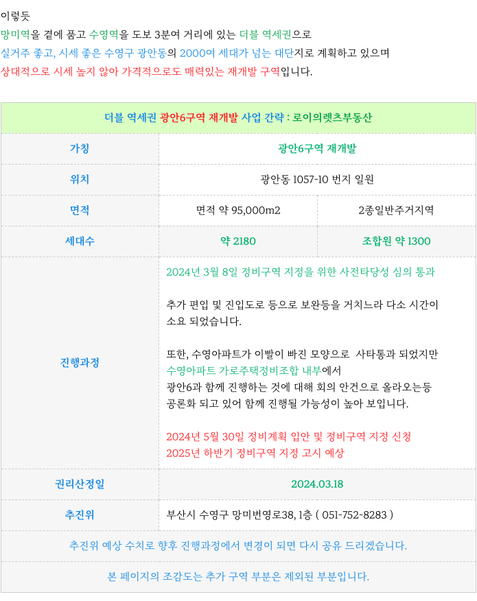 입지 좋은 광안6구역 재개발 : 현 최저 소액 급 매물 & 진행 상황 소개해 드리겠습니다.