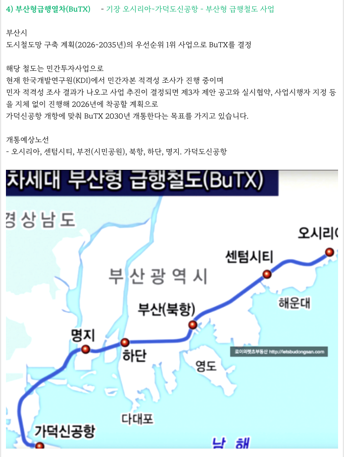 부산형급행열차 BuTX가 부산시에서 우선순위 1순위로 추진중인데