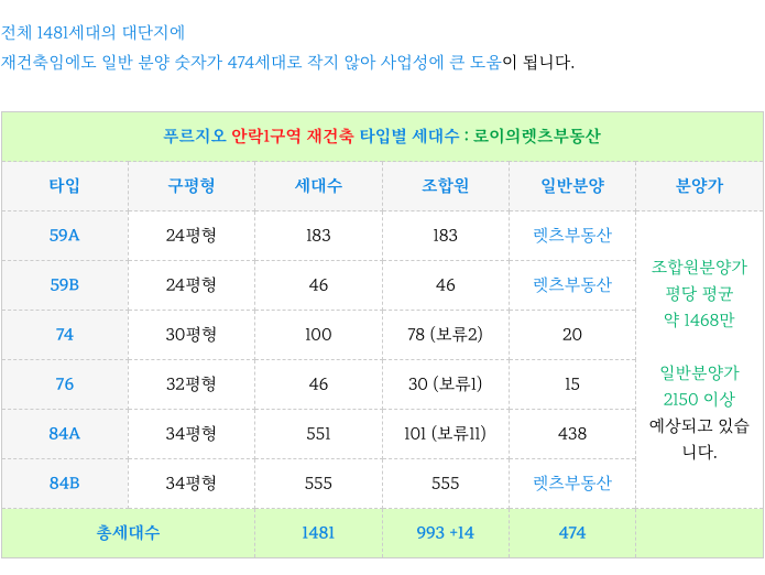 4. 안락1구역 재건축 : 조합원 분양가 + 타입별 세대수 :
