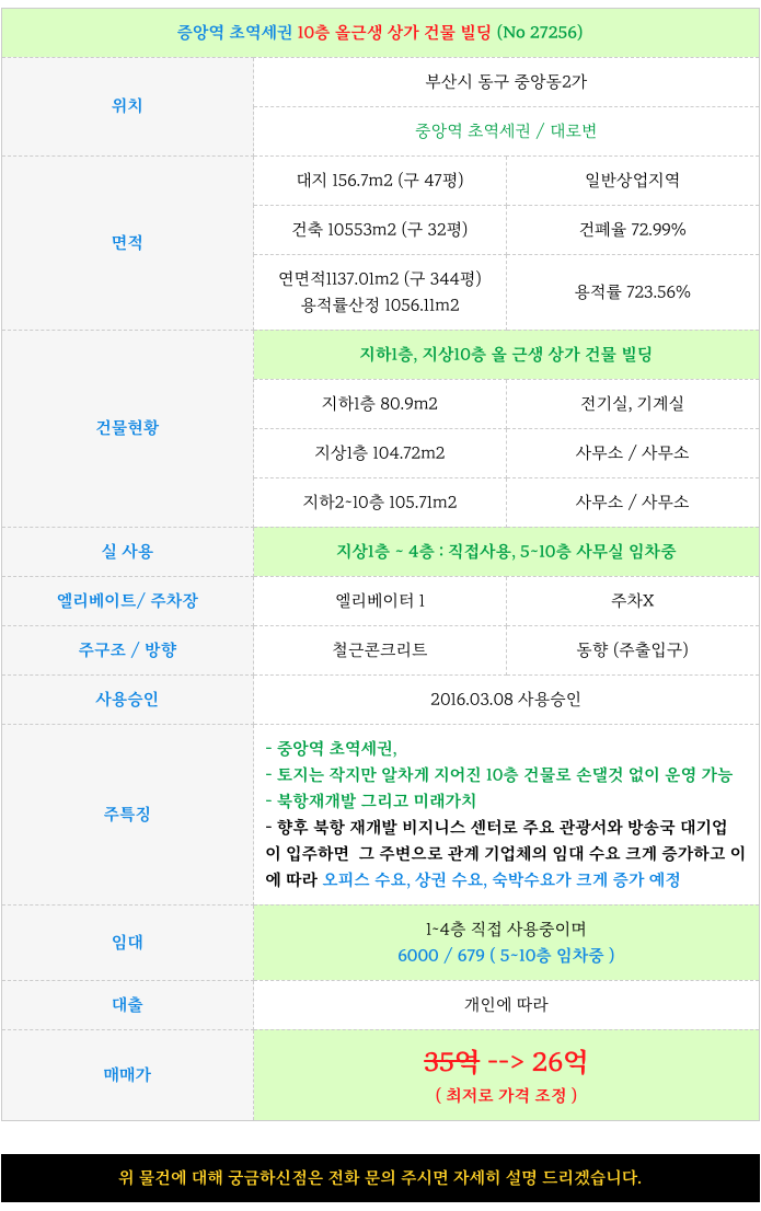 오늘 중앙역 초역세권 10층 올근생 상가 건물 빌딩 상세 제원 소개해 드립니다. (No 27256 )