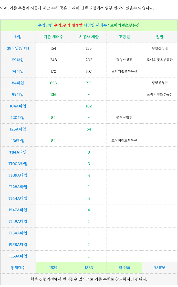 5. 수영1구역 재개발 : 계획된 각 타입별 세대수 :