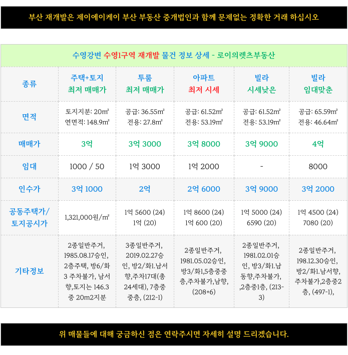 2. 수영1구역 재개발 : 현재 가능한 매물 소개 :