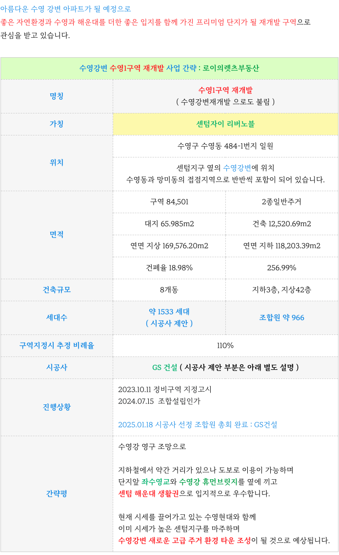 수영1구역 재개발 : 현재까지 진행 사항 & 예상 일정 체크 : 등 추가 정보는 아래 페이지를 참고 부탁드립니다.