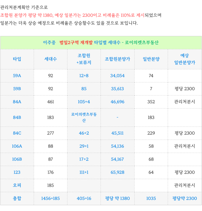 4. 타입별 세대수, 조합원 분양가 체크 : 범일2구역 재개발 :