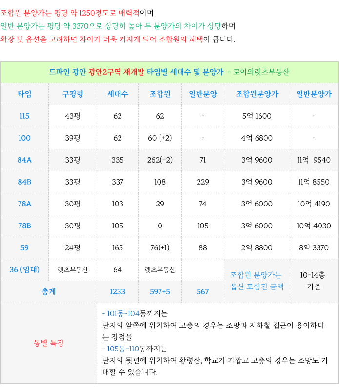 광안2구역 재개발 가격조정된 100타입 매물 포함 조합원 입주권 매물 소개해 드리겠습니다.