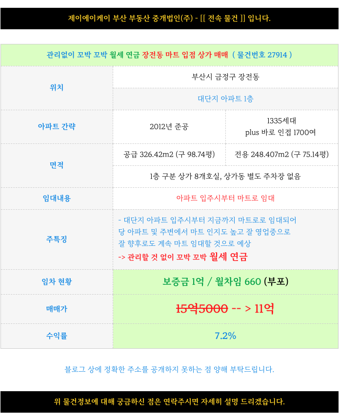 (JAK전속) 큰폭 가격 조정 + 안정적 월세 = 장전상 상가 매매