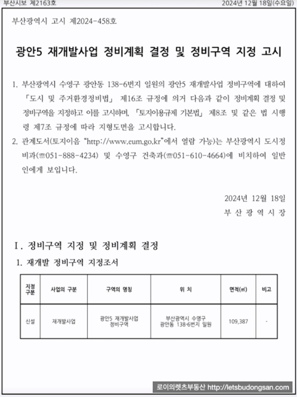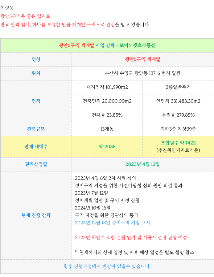 광안5구역 재개발 : 재개발 사업 주요 진행 사항 & 이후 예상 일정 : 등 추가 정보는 아래 페이지를 참고 부탁드립니다.