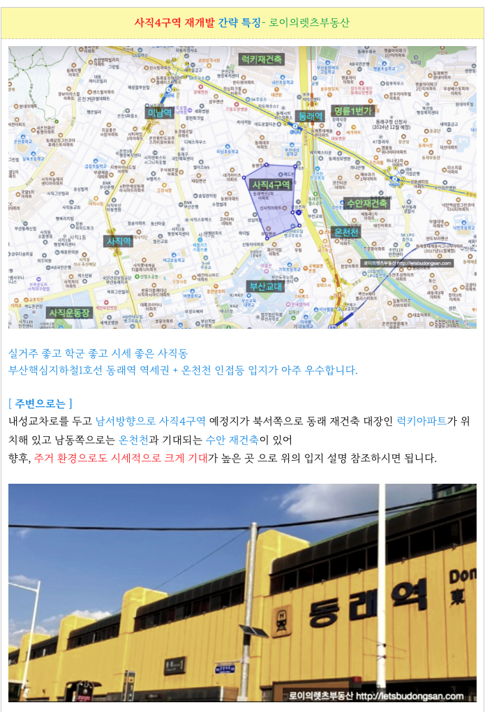 실거주 좋고, 학군도 좋아 시세도 우수한 동래구 사직동의 재개발 구역으로 관심이 높은 곳입니다.