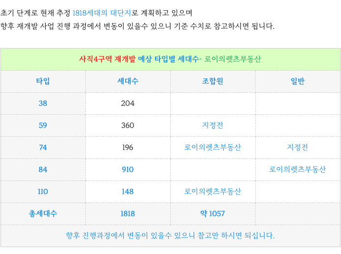 4. 사직4구역 재개발 : 계획된 각 타입별 세대수 :