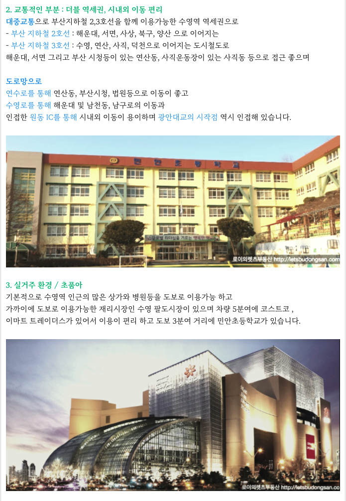 - 수영역 더블 역세권 : 부산 지하철 2호선, 3호선 환승센터.