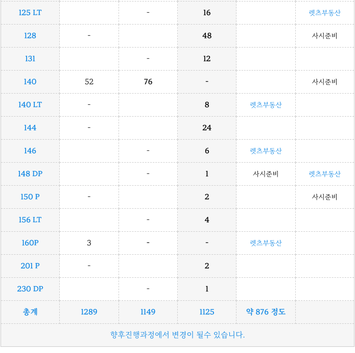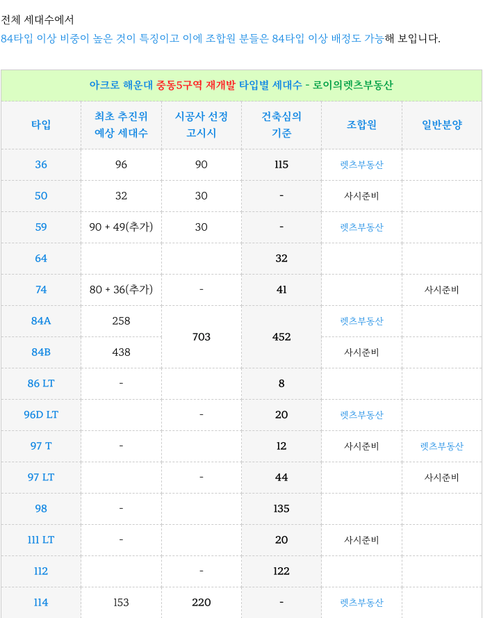 3. 증동5구역 재개발 : 계획된 각 타입별 세대수 :